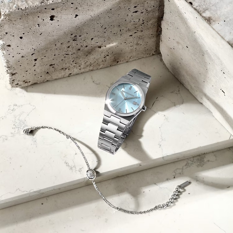 OROLOGIO TRUSSARDI "T-MILANO" - R2453175501 - Genere: Donna - Materiale e finitura cassa: Acciaio lucido e satinato - Misura cassa: 34 mm - Spessore cassa: 9 mm - Colore cassa: Silver - Vetro: Vetro minerale - Quadrante: Azzurro metallizzato, con indici, lancette e dettagli in metallo color silver - Materiale bracciale: Acciaio inox - Colore cinturino: Silver - Chiusura: Fibbia diver con blocco sicurezza - Movimento: Quarzo giapponese a tre sfere, con data - Water resistant: 5 atm - Garanzia: Ufficiale 2 anni Trussardi.