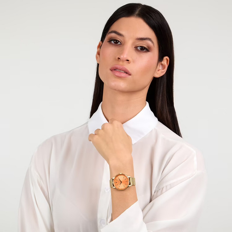 Orologio da donna, con movimento al quarzo giapponese e funzioni di solo tempo, a due sfere - Cassa rotonda in acciaio inox dorato Ip gold, dal diametro di 34 mm e spessore di 7,2 mm, con lunetta in acciaio lucido - Quadrante Pesca metallizzato, con cristalli indici e lancette in metallo color oro - Bracciale in acciaio inox lucido dorato Ip gold, a maglia Milano - Chiusura scorrevole in acciaio - Resistente all'acqua fino a 5 atm