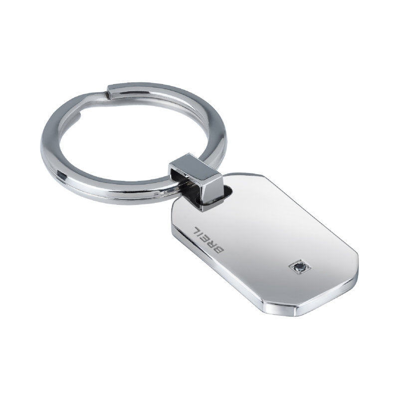 Portachiavi da uomo di Breil della collezione black diamond, con piastrina in acciaio inox 316L lucido e diamante nero con 2 pt. di carato, personalizzabile.