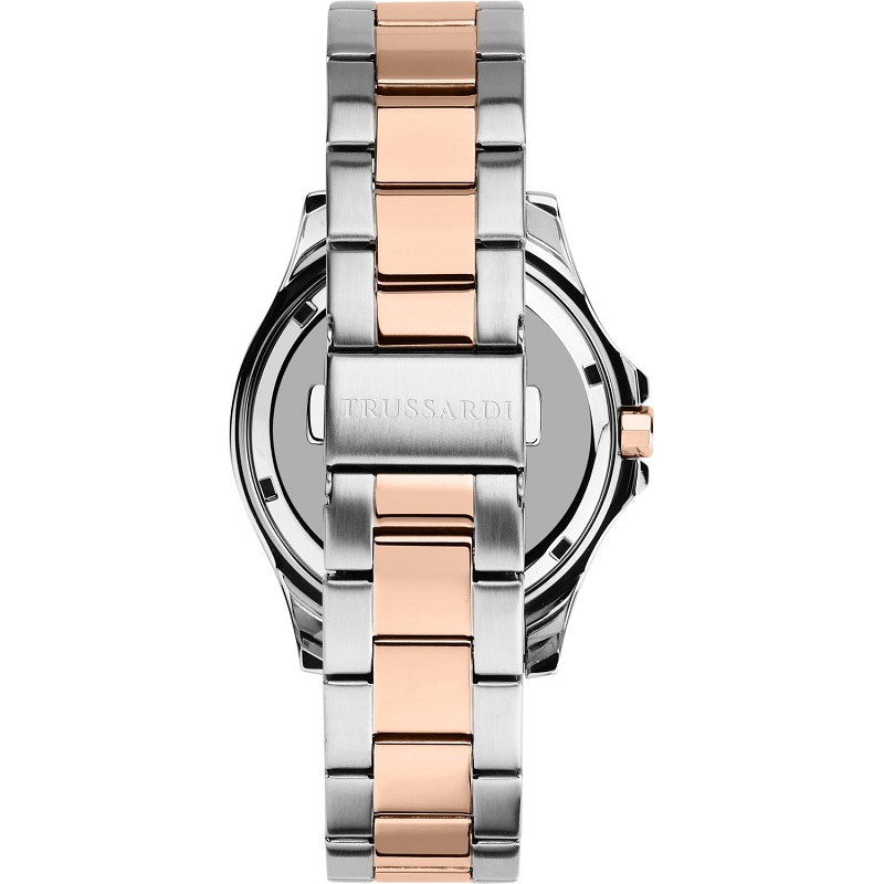 Movimento giapponese Multifunzione - Quadrante nero antracite, con logo, indici e dettagli Trussardi in metallo color oro rosa - Lancette e indici luminosi al buio - Cassa e bracciale in acciaio inox bicolore - Lunetta cassa in acciaio Ip gold e indicazione scala 60 secondi su metallo nero/marrone - Diametro cassa 42 mm, spessore 11,20 - Bracciale in Acciaio Bicolore (color argento-oro rosa) - Chiusura Fibbia deployante con pulsanti, in acciaio inox - Water Resist 5 atm.